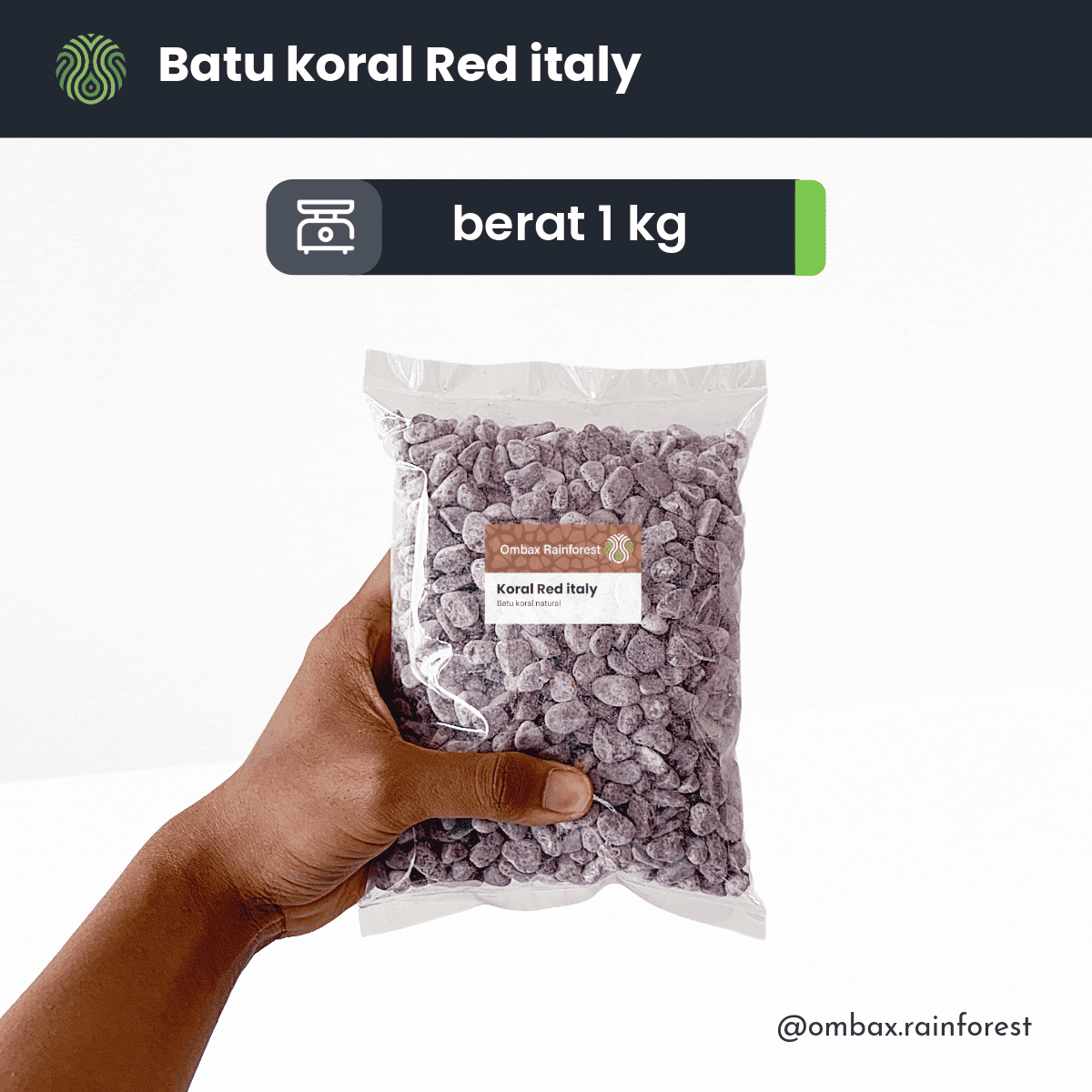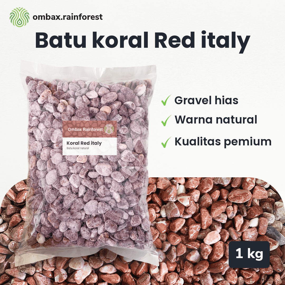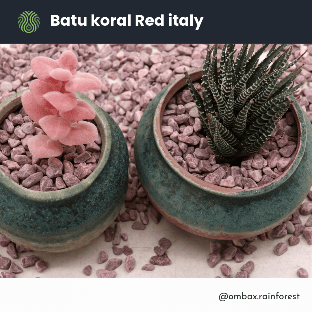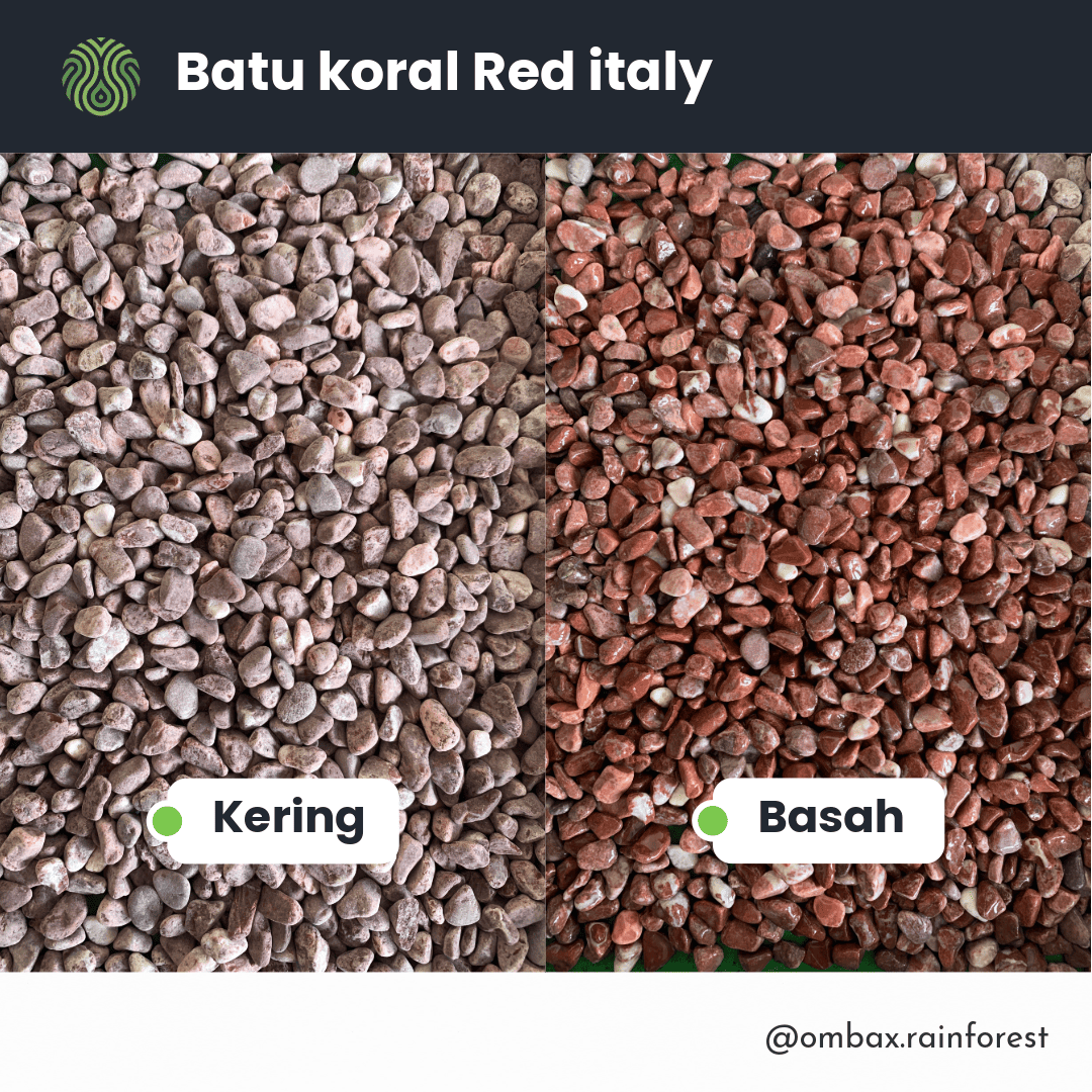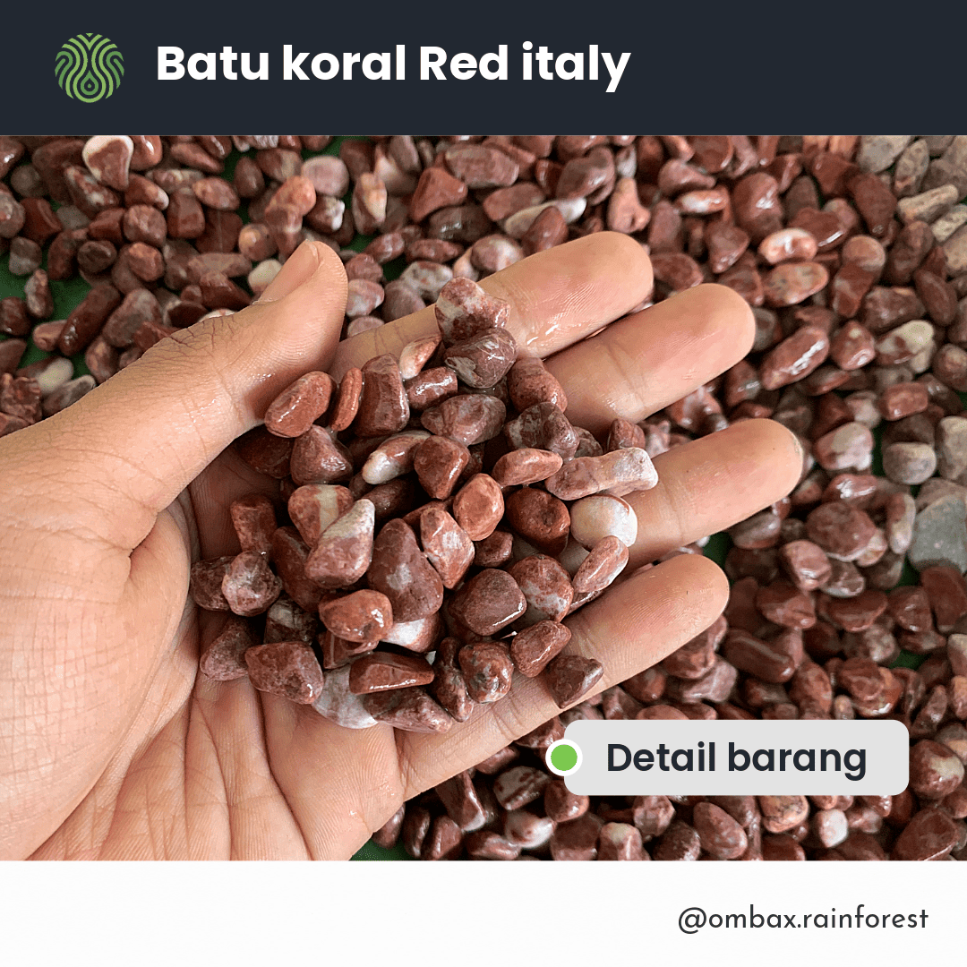 Batu Koral Red Italy dari Ombax Rainforest merupakan batu dekoratif alami dengan warna merah bata yang memberikan kesan hangat dan elegan pada berbagai media dekorasi.
