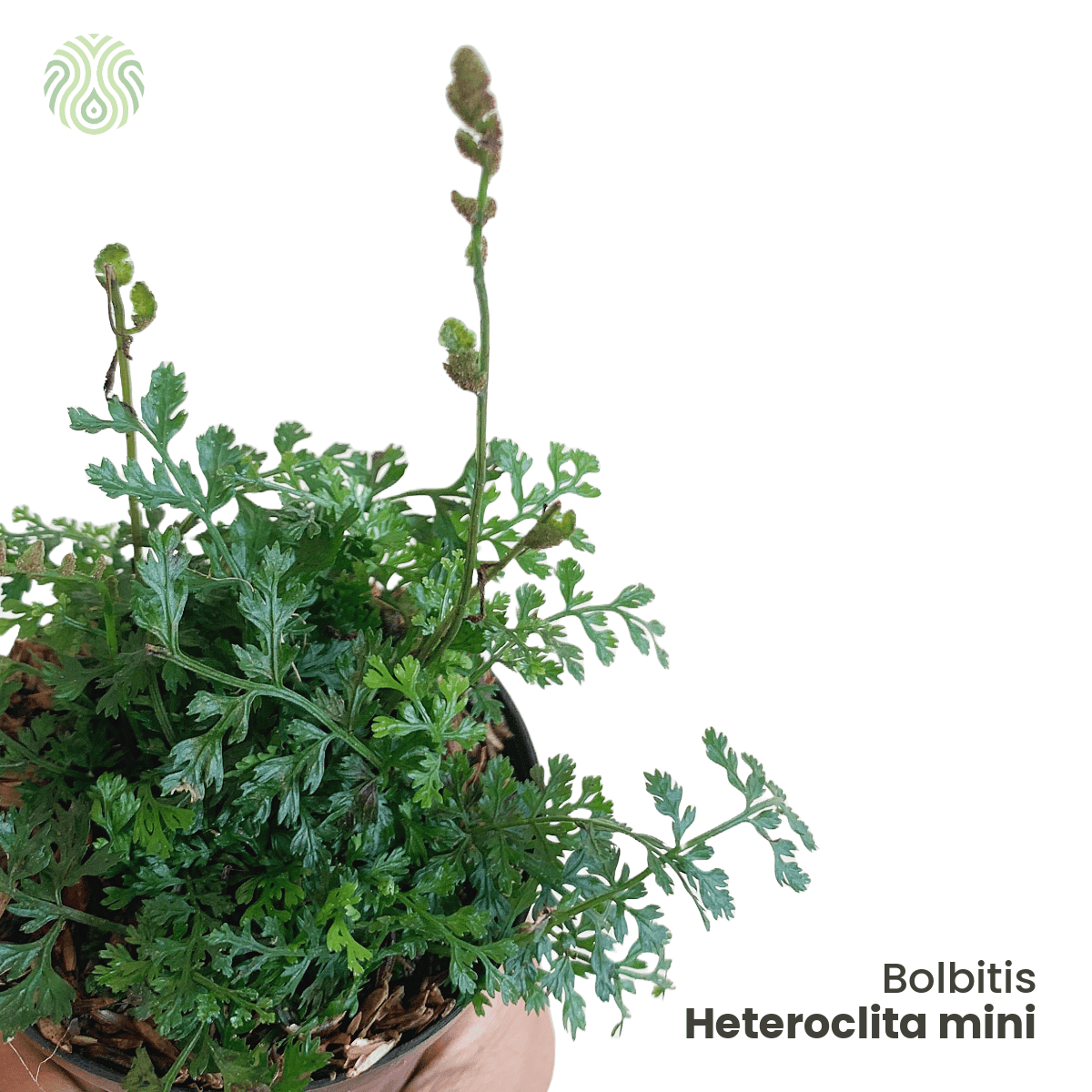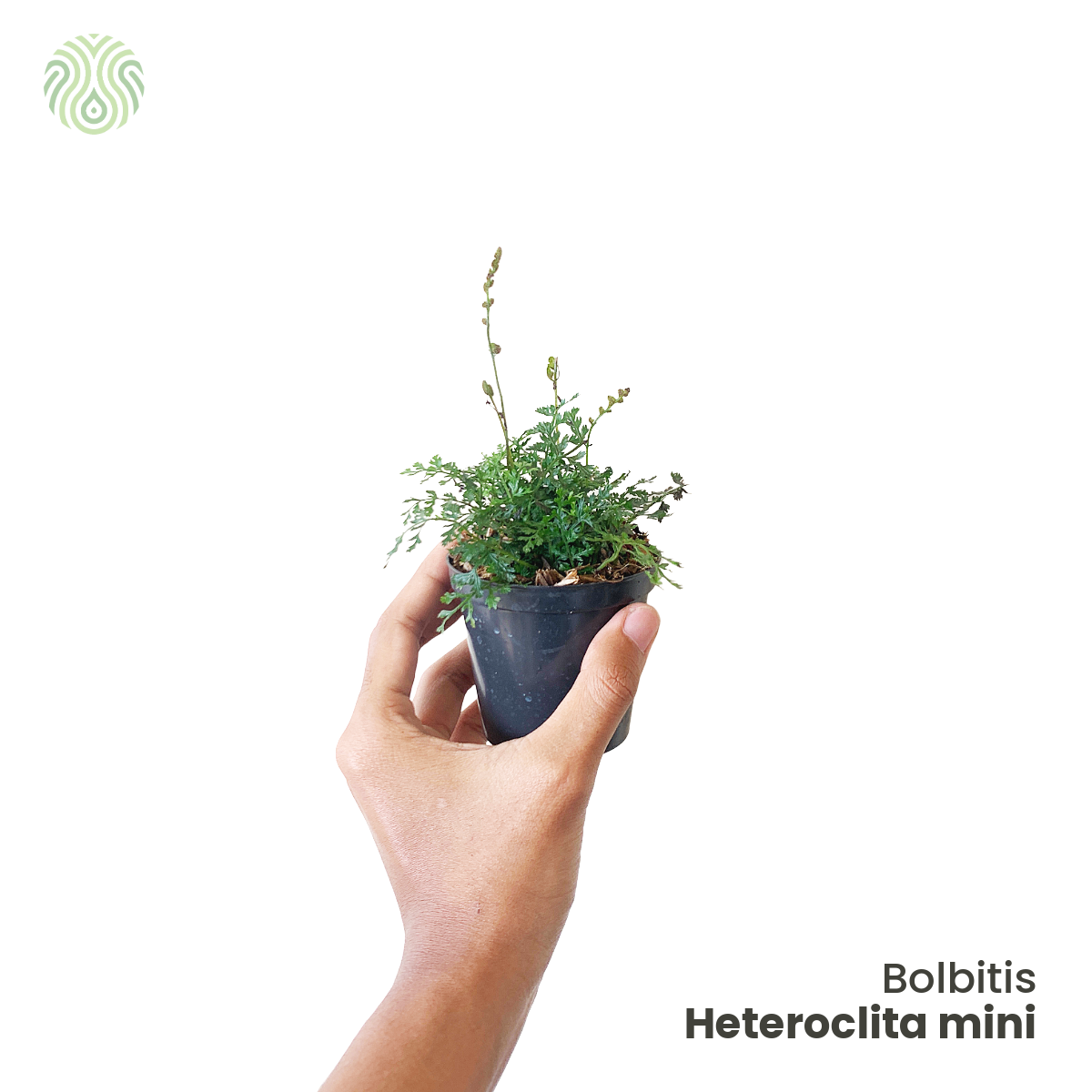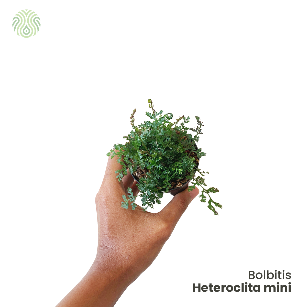 Bolbitis ‘Heteroclita mini’ memiliki daun-daun yang hijau gelap dan berbentuk lanset. Daun-daunnya terlihat seperti daun tumbuhan paku kecil dan memiliki tekstur yang bergerigi di sepanjang tepi daunnya.