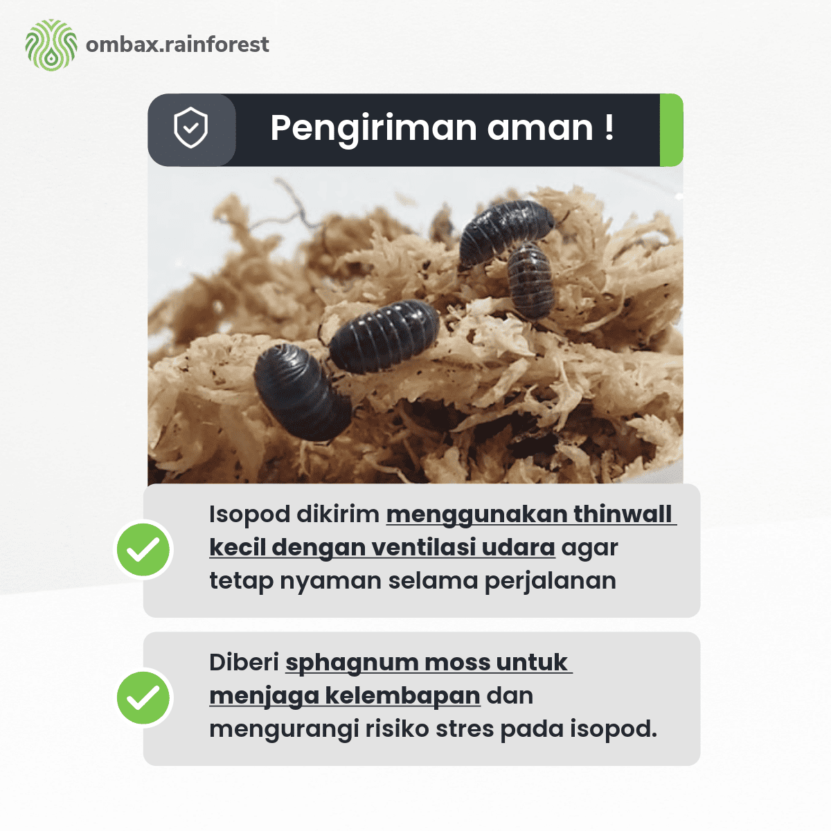 Kami memastikan isopoda dikemas dengan hati-hati menggunakan media lembab khusus untuk menjaga kesehatan selama pengiriman. Setiap paket dilengkapi dengan proteksi tambahan agar sampai ke tangan Anda dalam kondisi terbaik.