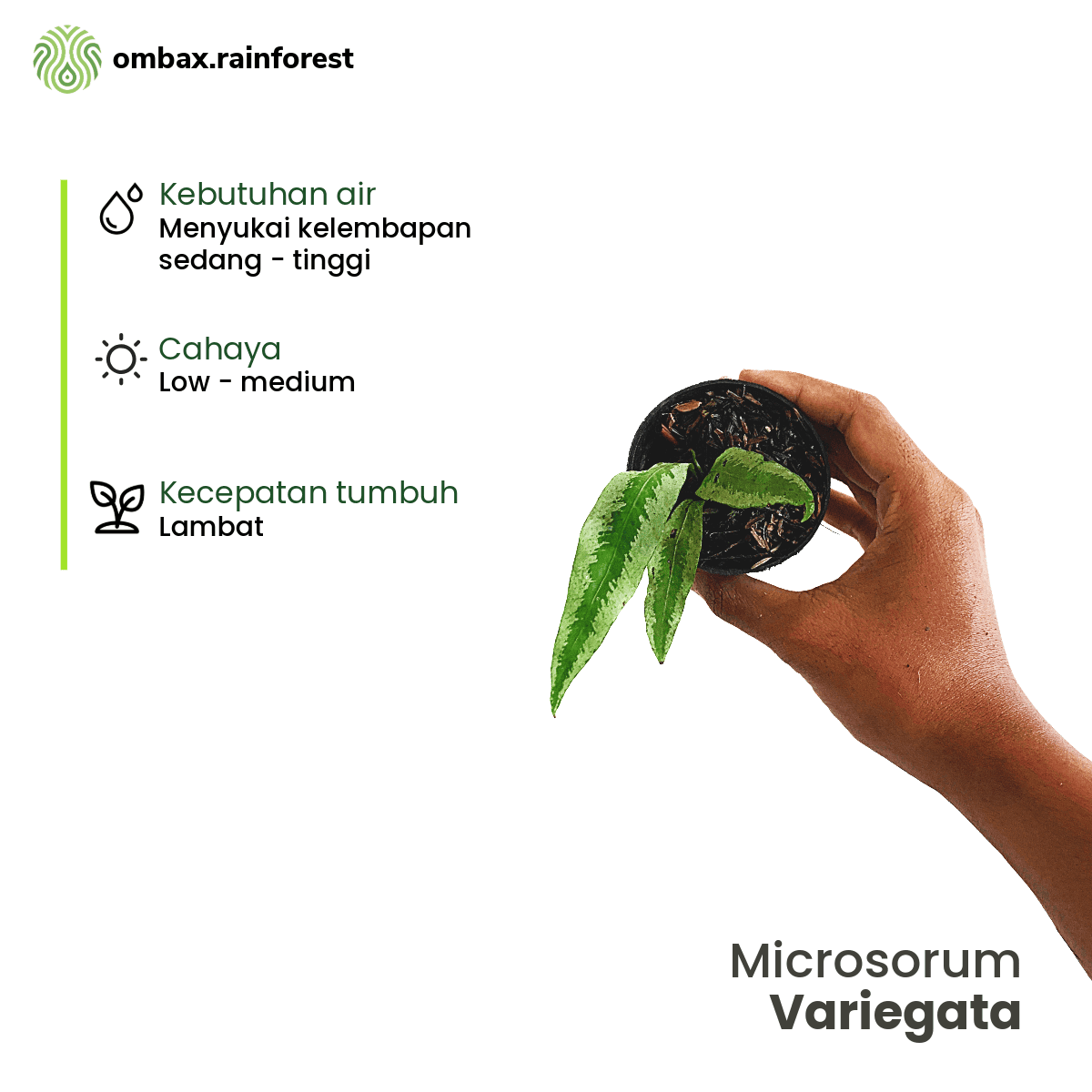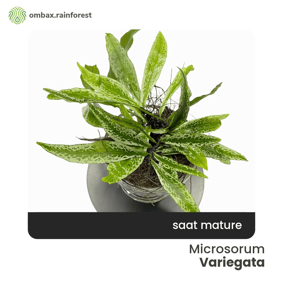Microsorum Variegata adalah tanaman pakis hias dengan corak daun alami yang unik dan kontras. Cocok untuk terrarium, vivarium, maupun indoor garden bernuansa tropis. Karakternya menyukai kelembapan dengan kebutuhan cahaya rendah hingga sedang, sehingga ideal untuk setup tertutup atau area minim sinar matahari langsung.