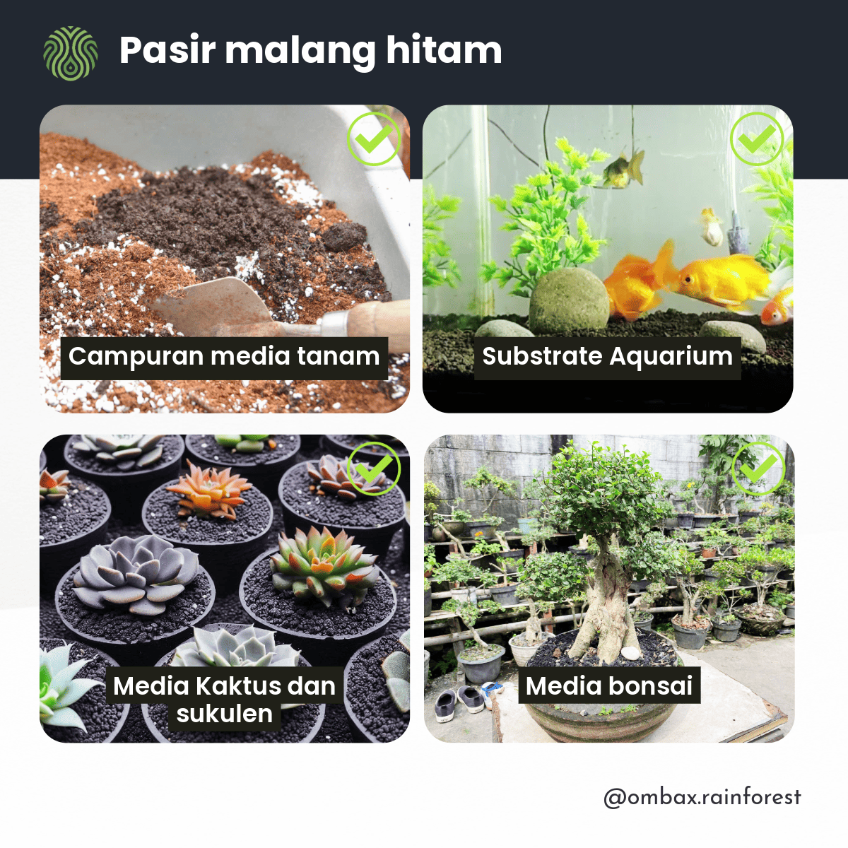 – Dengan Pasir Malang Hitam, Anda bisa menciptakan ekosistem tanaman yang sehat dan cantik, baik di dalam pot, terrarium, atau setup aquascape Anda. Cocok untuk berbagai jenis tanaman dan proyek dekorasi alami.