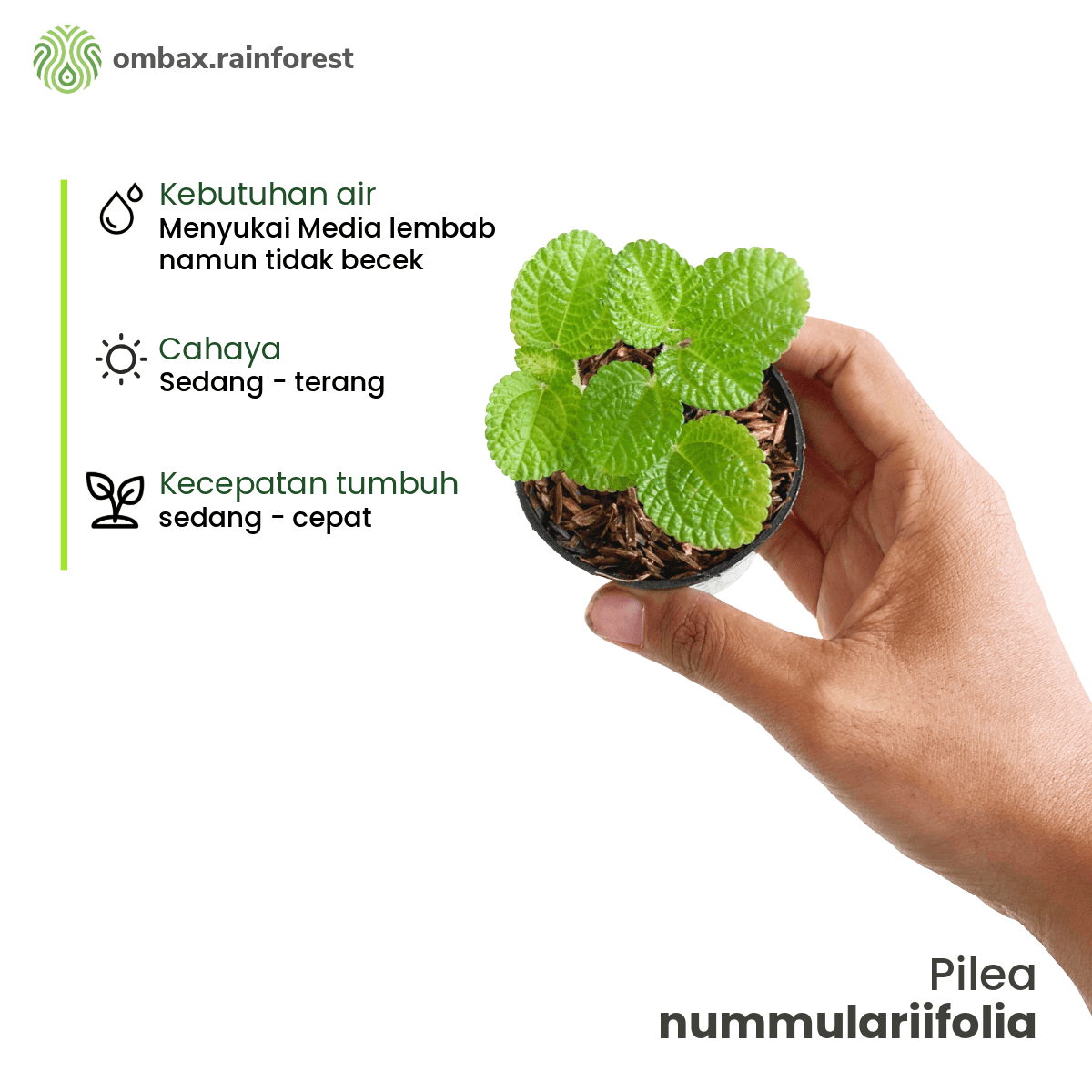 Tanaman hias rambat berdaun kecil hijau segar dengan tekstur mengkilap. Cocok sebagai ground cover dalam terrarium maupun vivarium karena mudah tumbuh, cepat merambat, dan tahan di lingkungan lembap.