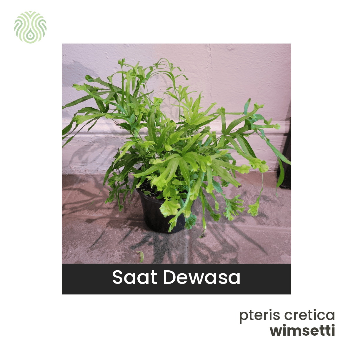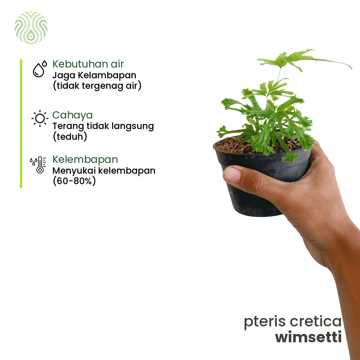 Pteris Cretica Wimsetti adalah tanaman paku hias dengan daun hijau segar berbentuk unik menyerupai sayap, memberikan kesan tropis alami pada terrarium, vivarium, maupun dekorasi ruangan.